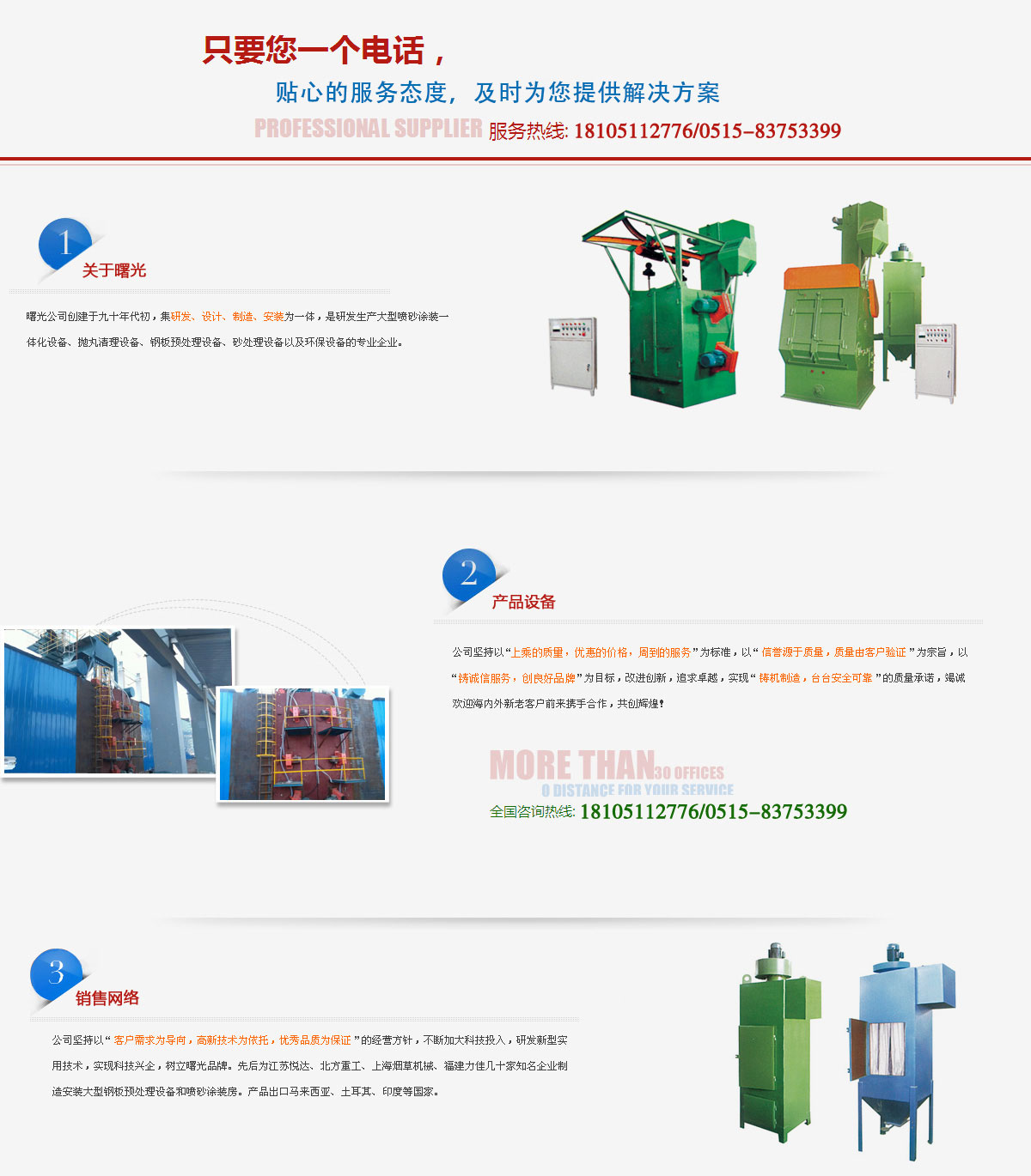 現(xiàn)建有三個(gè)生產(chǎn)廠(chǎng)區(qū),擁有各類(lèi)優(yōu)良的加工設(shè)備300多套,員工100多名,其中專(zhuān)業(yè)技術(shù)人員20多名。先后為江蘇悅達(dá)、北方重工、上海煙草機(jī)械、福建力佳等幾十家知名企業(yè),制造安裝大型鋼板預(yù)處理設(shè)備和噴砂涂裝房。產(chǎn)品暢銷(xiāo)江蘇、浙江、安徽、山東、湖南、湖北、河南、河北、四川、福建、山西、內(nèi)蒙古、北京、上海等全國(guó)二十多個(gè)省市,出口俄羅斯、馬來(lái)西亞...